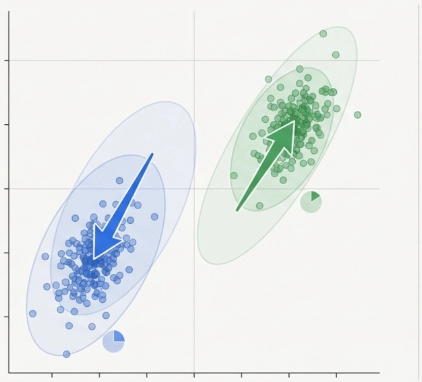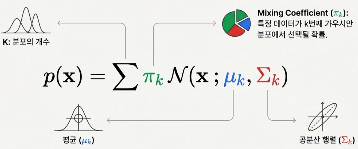 GMM은 간단히 말해 “복잡한 데이터의 분포를 여러 개의 정규분포를 합쳐서 설명하겠다”는 아이디어입니다. 하나의 정규분포로는 표현하기 힘든 복잡한 모양의 데이터를, 여러 개의 작은 정규분포 덩어리들로 나누어 맞추는 것이죠.
