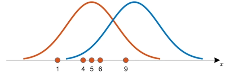 MLE 문제 예: 빨간색 분포와 파란색 분포 중에 데이터에 더 적합한 분포는 무엇인가? (출처: 공돌이의 수학정리노트)