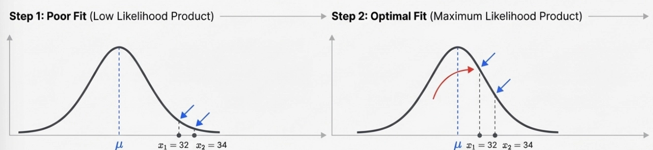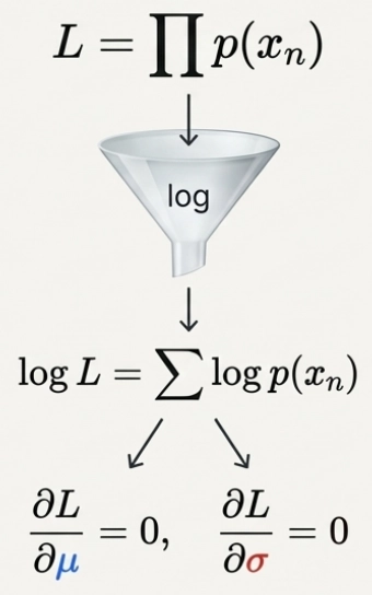 최대 우도 추정(Maximum Likelihood Estimation, MLE): 주어진 데이터가 나타날 확률(우도)을 최대화하는 분포의 모수(평균, 분산 등)을 역으로 추정하는 수학적 기법