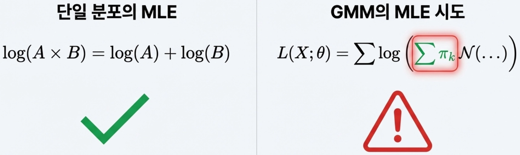 GMM의 경우 MLE를 바로 적용할 때 로그 함수 내부에서 가우시안 분포의 합(sum)이 존재하기 때문에 닫힌 형태(closed-form)의 방정식으로 정리되지 않는 문제점이 존재한다.