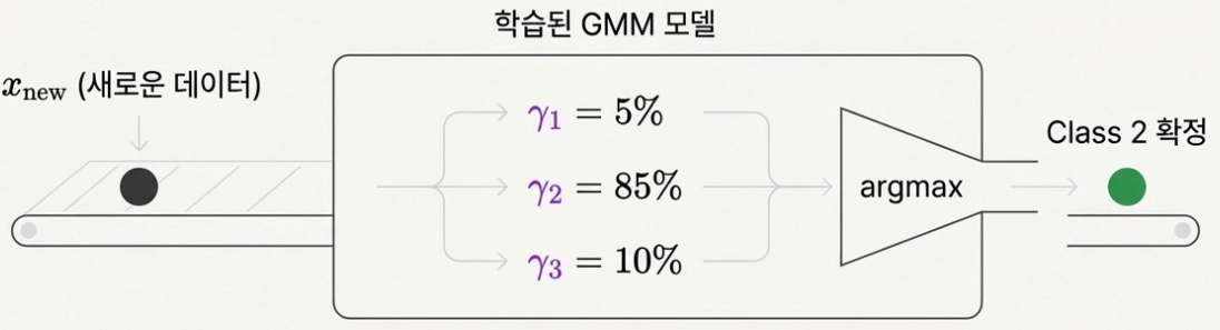 GMM은 새로운 입력 데이터 가 주어졌을 때, 각 가우시안 분포(class)에 속할 확률 를 계산하므로, 가장 높은 확률을 나타내는 를 찾는 연산을 통해 최종 Class 레이블을 예측하게 된다.
