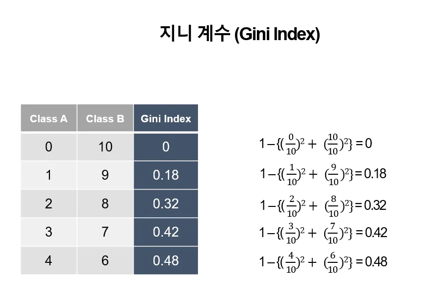 Gini Index (지니 지수): CART 에서 불순도 계산에 사용됨