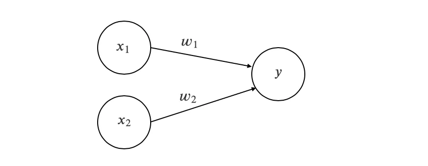 퍼셉트론의 기본 구조: 입력 신호(x1, x2), 가중치(w1, w2), 출력 신호(y)