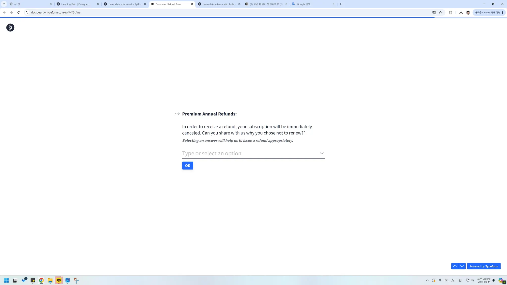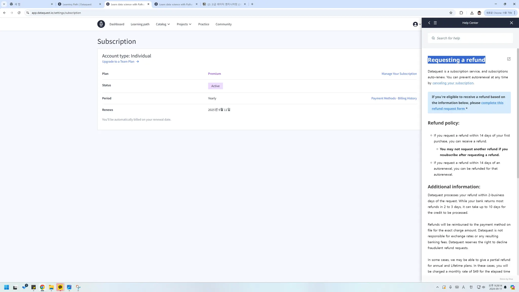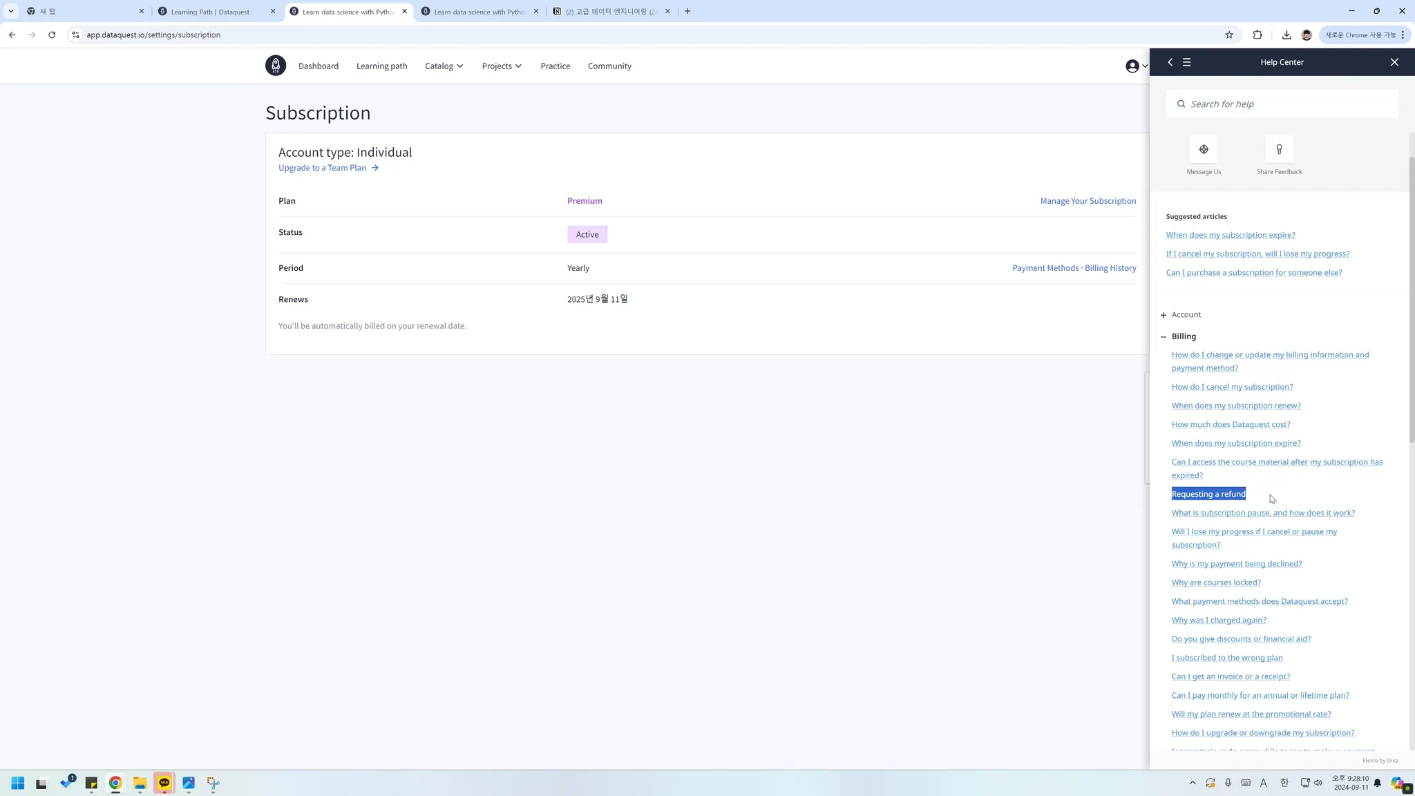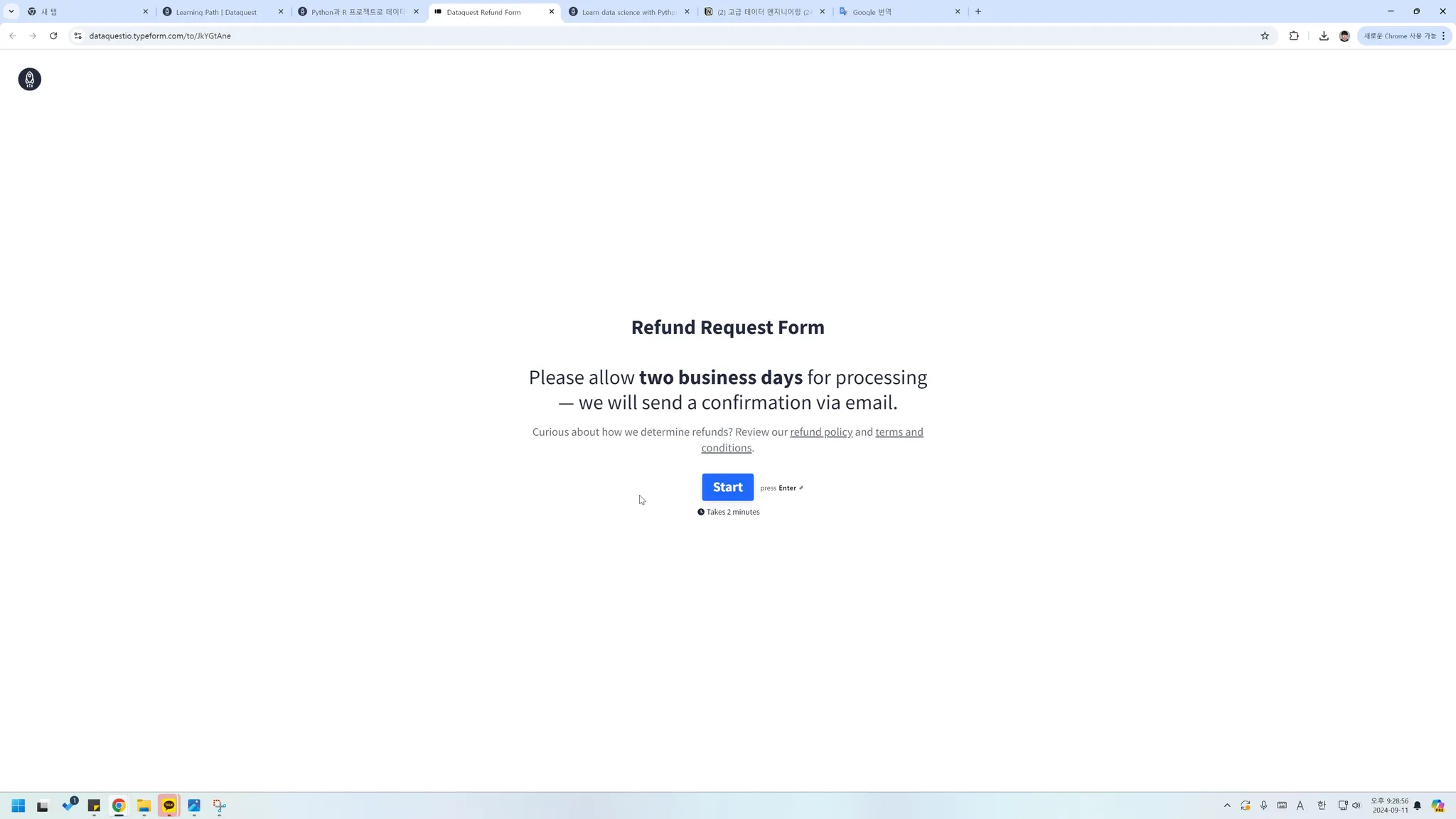 Requesting a refund 메뉴에서 Complete this refund request form 클릭