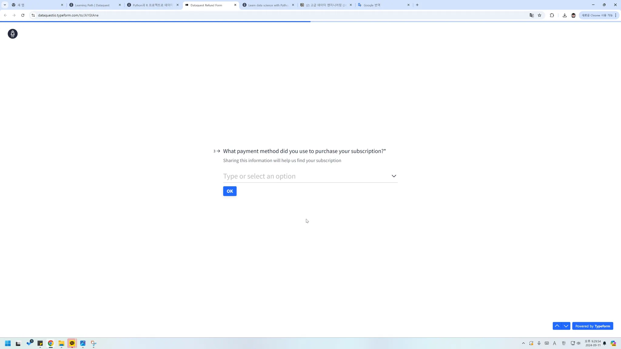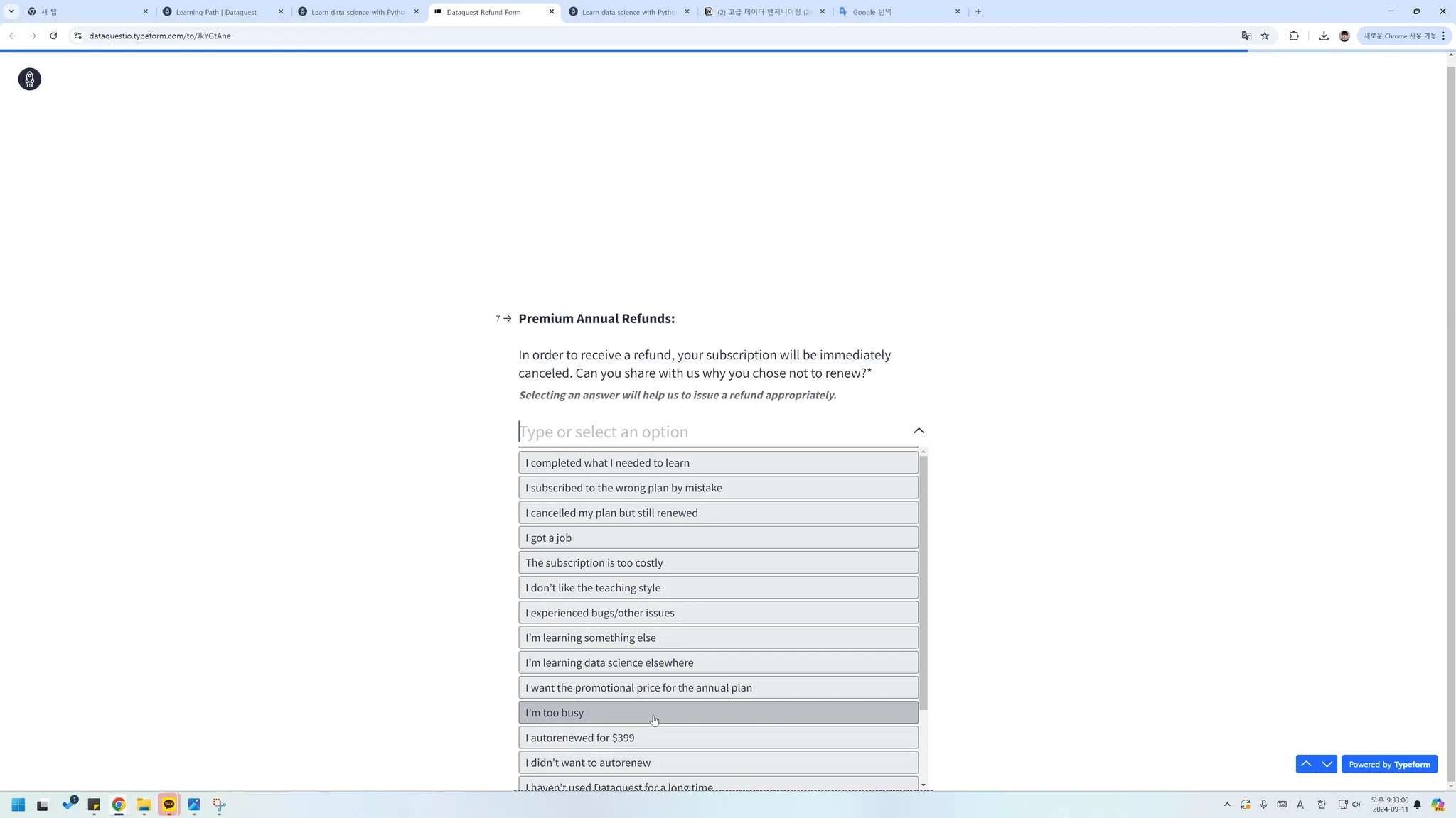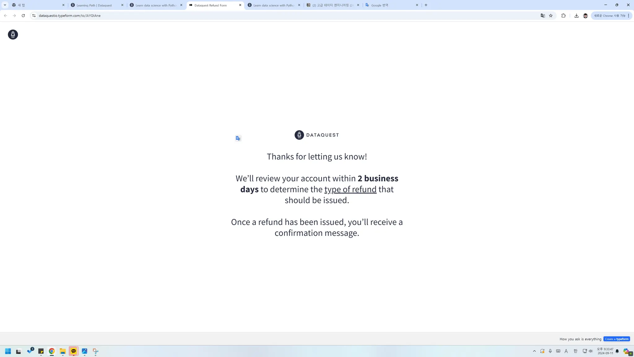 Requesting a refund 메뉴에서 Complete this refund request form 클릭