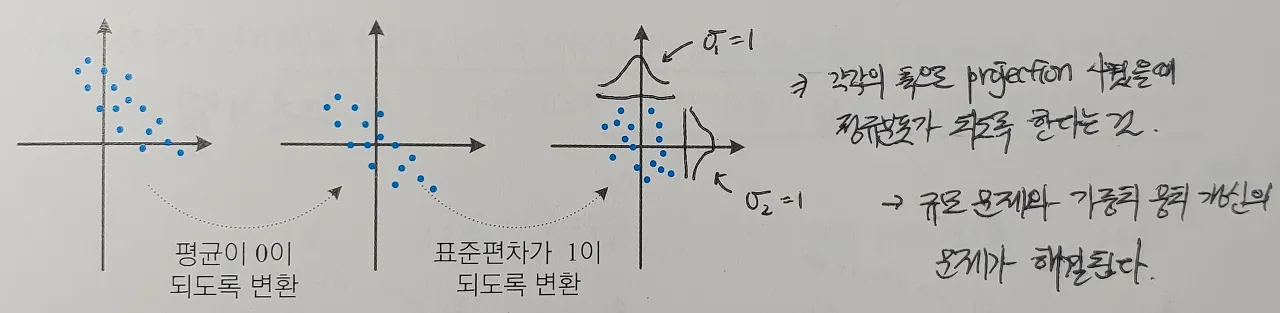 위 그림은 불균형한 데이터 분포를 평균이 0, 표준편차가 1이 되도록 변환한 것을 나타낸다. (정규화) 즉, 각각의 축으로 투영(projection)시켰을 때 정규분포가 되도록 한다는 것이다.