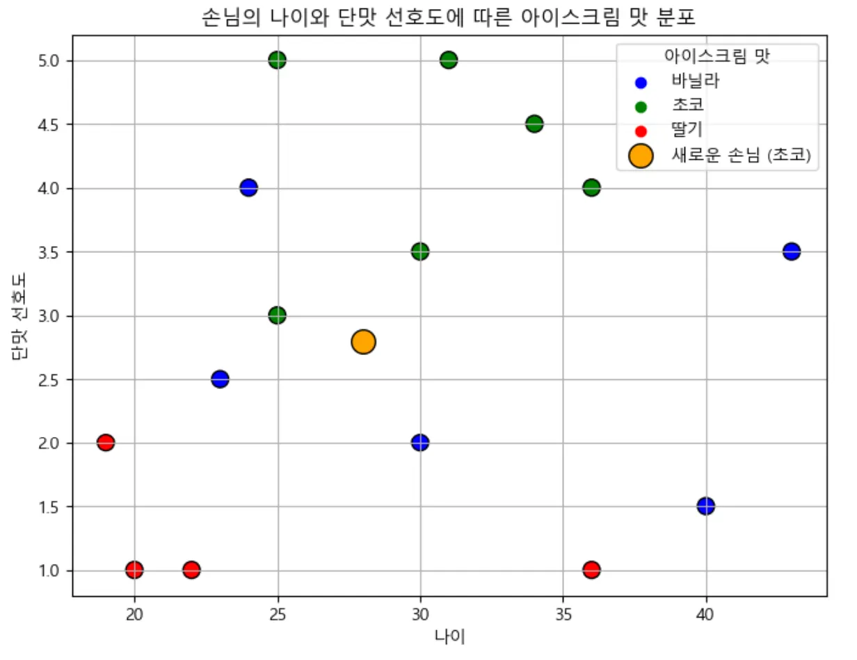 아이스크림 가게에서 새로운 손님이 들어왔을 때, 손님의 나이와 단맛에 대한 선호도를 바탕으로, 손님이 가장 좋아할 만한 아이스크림 맛을 추천해주는 장면. K-NN 알고리즘을 이용해 손님의 데이터를 기존 손님들과 비교하여 바닐라, 초코, 딸기 중 가장 적합한 맛을 예측. (당도 : 초코 > 바닐라 > 딸기)
