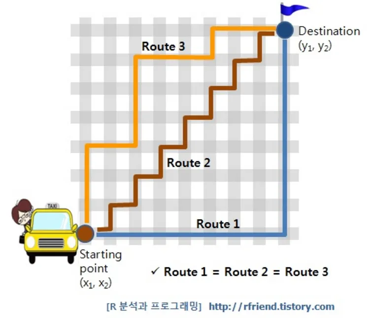 두 점 사이의 수직 및 수평 거리의 합을 구하는 방식으로, 격자 형태의 경로에서 이동할 때의 거리를 구하는 방법