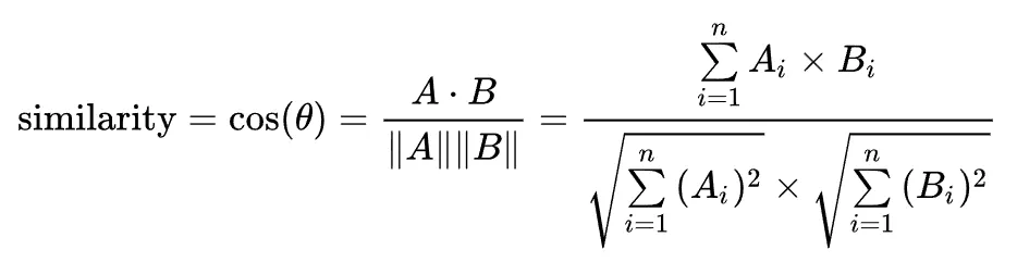 두 벡터 간의 각도를 측정하여 유사성을 계산하는 방법으로, 값이 1에 가까울수록 두 벡터의 방향이 유사하다는 것을 의미