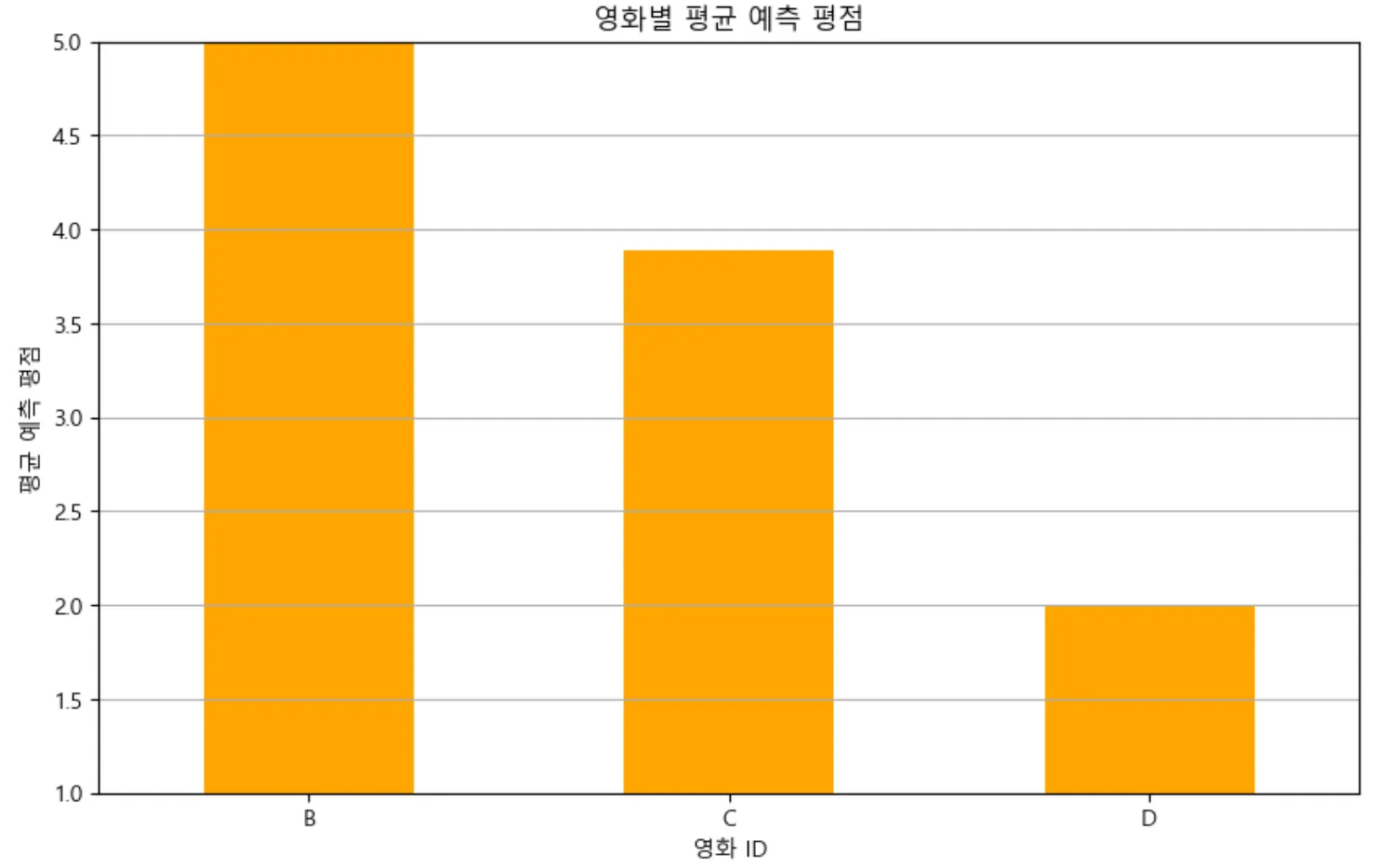 사용자 1이 영화 'C'에 대해 예측한 평점은 3.67로 나타남. 이는 사용자가 'C'에 대해 긍정적인 평가를 할 가능성이 있음을 나타냄.